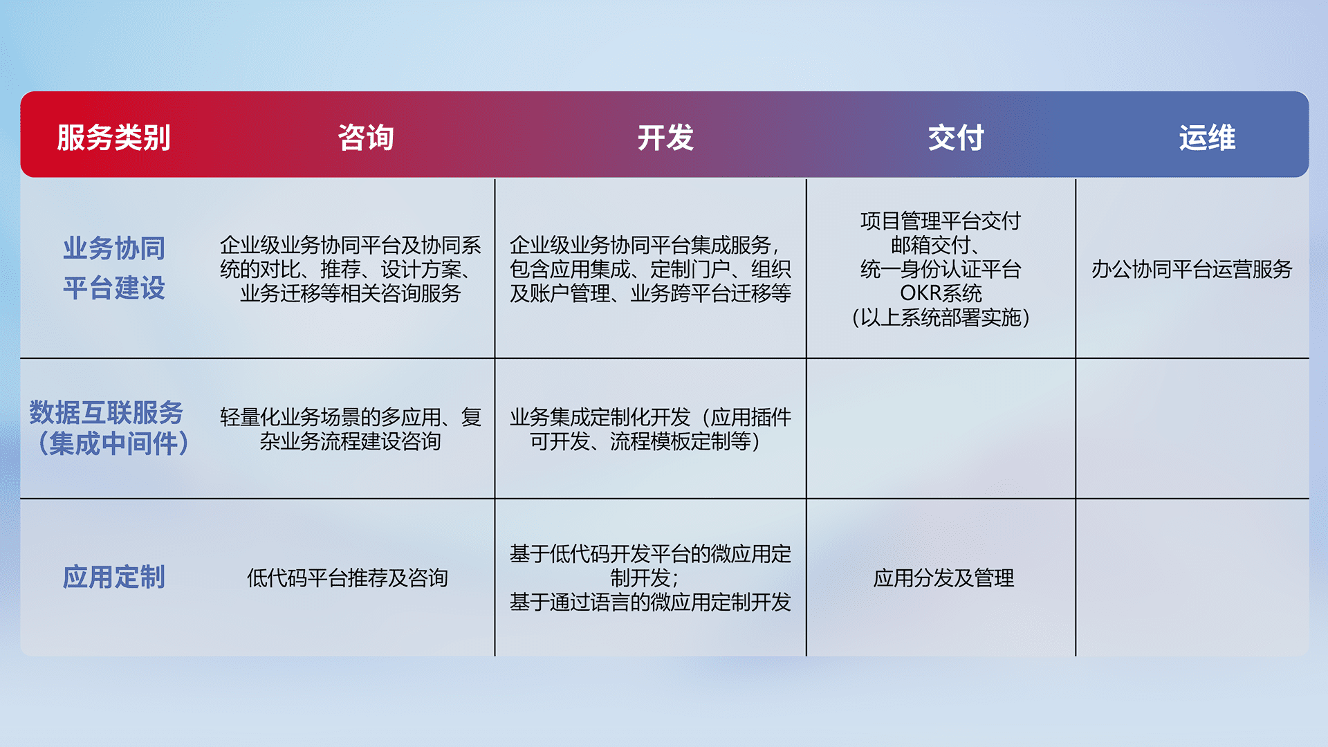 针对钉钉、、、企微、、、、IDaas等平台级产品提供产品的规划、、、、方案、、、、交付、、、、定制化开发等服务,,,实现如统一协同办公、、、智能客户服务、、、混合会议管理、、、智能数据查询、、等业务场景,,,实现数字化转型。。。。